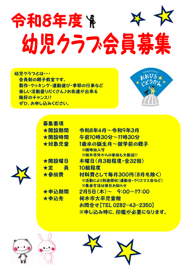 なお、なるべく一年間参加できる方を募集しますが、幼稚園等途中入園で、幼児クラブを途中退会する方も参加可能です。その場合は、申込時にお知らせください。